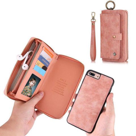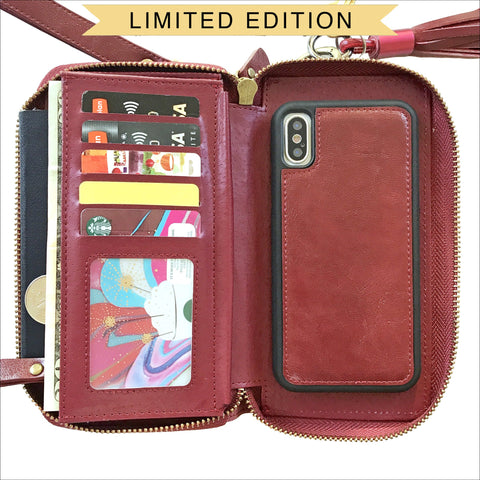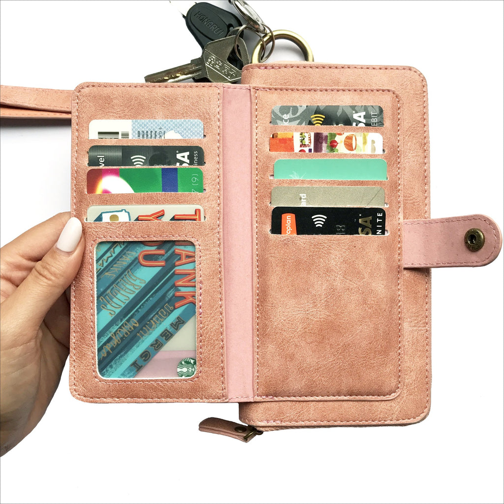 Featuring an extensive cardholder in the front and a high-quality zip closure wallet at the back with a matching detachable wristlet strap.